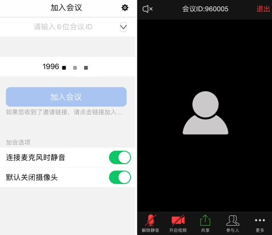登录成功后,可以预先设置加会选项,比如麦克风是否静音和摄像头的开与关,再输入6位会议ID后,即可进入会议频道,会议窗口是进行最小化的,与手机跟随系统。