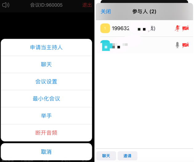 在会议中,可以选择“申请当主持人”、“聊天”以及“举手”。“申请当主持人”这个功能是当原主持人离开会议的情况下,并且需要输入密码才能使用,与会者可以邀请其他人参与会议,以及文字聊天,其次还可以设置美颜和字幕功能。