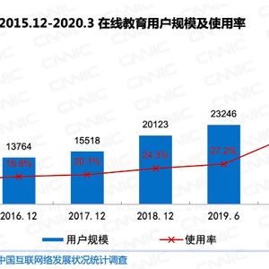 根据中国互联网络信息中心(CNNIC)第45次《中国互联网络发展状况统计报告》,截止2020年3月,我国在线教育用户规模达4.23亿,占网民整体的46.8%,自2019年6月至今增 长1.91亿;手机在线教育用户规模达4.20亿,占手机网民的46.9%,自2019年6月至今增长2.21亿。