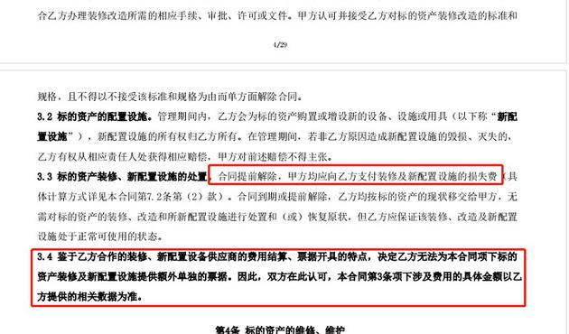 一位房东向新浪科技提供了自如与其签订的合同。其中提到:合同提前解除,甲方均应向乙方支付装修及新配置设施的损失费。鉴于乙方合作的装修、新配置设备供应商的费用结算、票据开具的特点,决定乙方无法为本合同项下标的资产装修及新配置设施提供额外单独的票据。因此,双方在此认可,本合同第3条项下涉及费用的具体金额以乙方提供的相关数据为准。