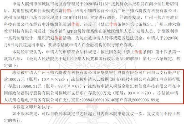 6月29日,据中国裁判文书网公示的一则《行政裁定书》显示,淘宝旗下社交电商平台“淘小铺”运营方广州三帅六将教育科技有限公司及相关公司等因涉嫌传销被冻结4400多万元。