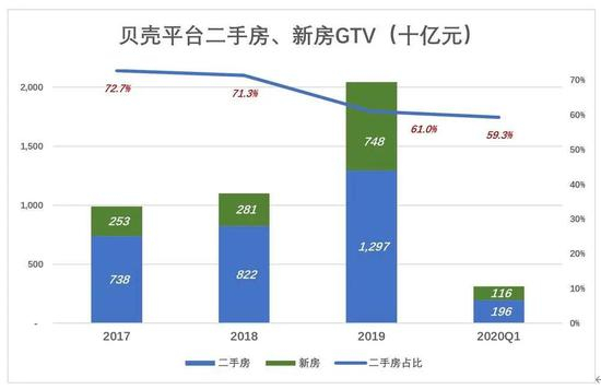 贝壳平台GTV有三个组成部分:二手房、新房、新兴业务(占比只有几个百分点)。