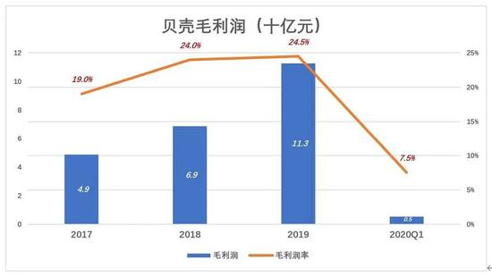 2019年贝壳平台毛利润为113亿、毛利润率24.5%。2020Q1,毛利润率骤降至7.5%,显然是因为疫情影响收入而固定成本(如底薪、门店租金等)降不下来。