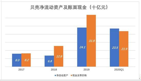 可以用两个指标衡量贝壳的流动性。账面现金不必解释,“净流动资产”是流动资产减流动负债的余额。(流动资产包括账面现金及一年内可以方便变现的资产,也就是理论上可以拿出现金的上限。流动负债是一年内必须支付的款项,如应付账款)。