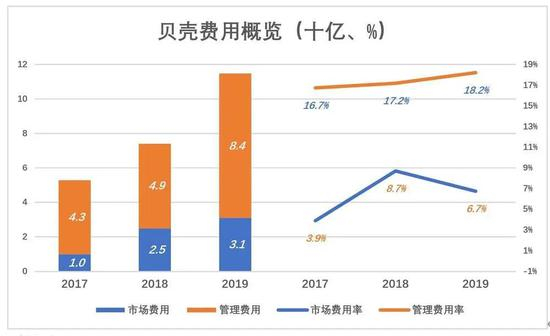 贝壳平台管理费用率较高,2018年、2019年管理费用率分别为16.7%、17.2%。