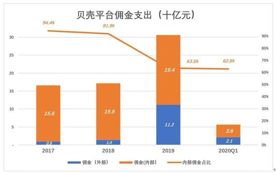 贝壳平台最大的成本佣金。2017年,支付链家旗下经纪人的佣金达156亿、占总佣金支出的94.4%;2019年,链家内部经纪人获得佣金194亿,占比降至63.5%,链家向外支付佣金112亿。