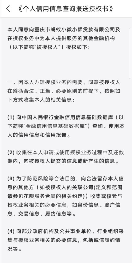 对此,蚂蚁集团方面当天向新京报贝壳财经记者表示,自2018年5月花呗宣布向银行等金融机构开放以来,已经有数十家金融机构参与共同服务花呗用户。近期,根据部分合作金融机构的要求,为了持续给用户提供优质的服务,需要对这部分用户的服务协议进行升级,其中包括用户需同意征信授权。