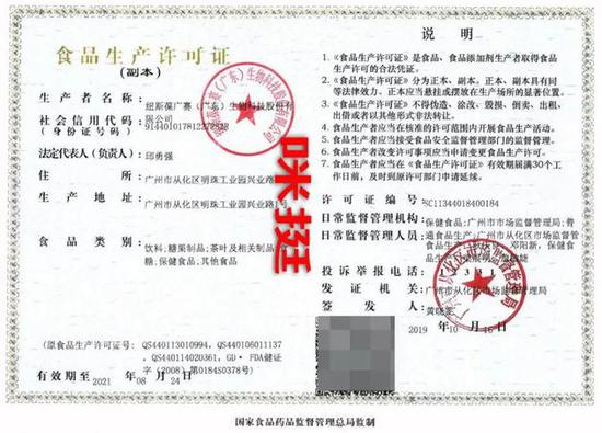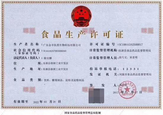 随后卖家还发来营业执照和食品生产许可证,食品类别一栏标注的只是糖果制品、保健食品。