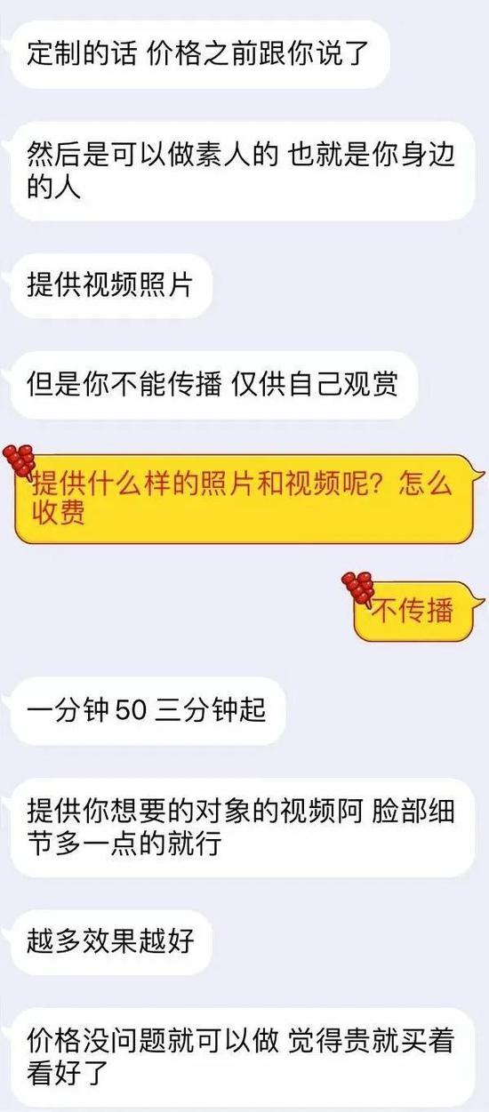只要买家提供身边人的照片和视频,素材越多越真实。对方开价一分钟50元,三分钟起,至少150元,显然素人比明星更贵,“不能传播,仅供自己欣赏。”卖家奉劝道。