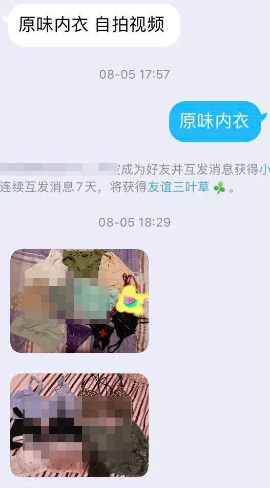 看到女买家便已读不回,看到感兴趣的男买家,卖家便会回复一个微信号或QQ号,当添加QQ后,“原味内衣、自拍视频 ”等常常是卖家兜售的商品,为了让用户看货,丢来一堆没洗的内衣、内裤或丝袜照片。