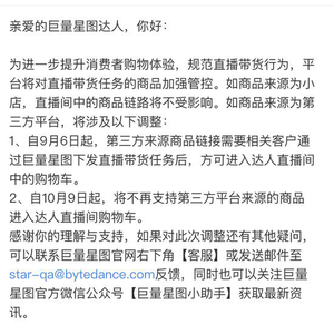 抖音相关负责人称,为进一步保护消费者权益,平台将加强直播带货管控。从9月6日起,第三方平台来源商品直播分享需要通过巨量星图平台匹配直播带货达人;