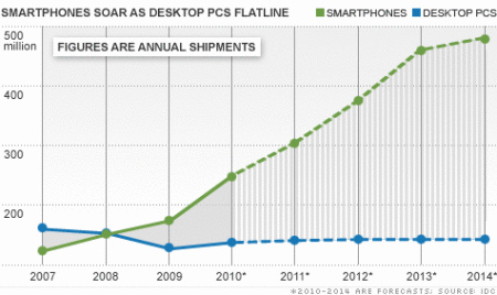 与去年同期相比,智能手机的销量上升了57%。4月份以来,苹果已经售出300万台iPad。专家预计,2013年平板电脑的销量会超过台式机,全球范围内安装智能手机的数量也会超过台式机。