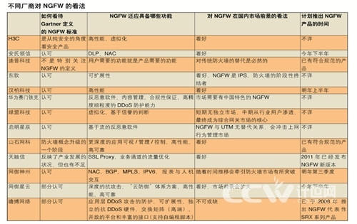 对于NGFW产品在国内的市场前景,受访厂商也普遍表示看好。虽然不少厂商认为NGFW与UTM现阶段存在竞争,但必将逐渐替代防火墙、IPS、UTM,成为阶段性的终结者。启明星辰还提到了上网行为管理产品,认为NGFW的发展会对这类产品的市场产生冲击。绿盟科技的观点则更加明确,认为NGFW短期内不会有独立市场,中期来看将从行业用户处开始普及,最终会成为综合网关市场的核心产品。而华为赛门铁克则认为,有中国特色的NGFW必将成为市场的宠儿。
