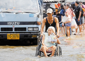 10月26日,在泰国首都曼谷,一名男子推着一名老年妇女行走在洪水中。 新华社发
