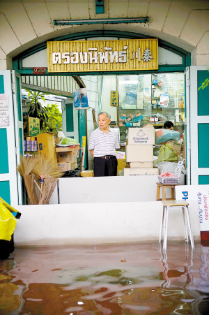 挽帕区居民甘雅拉告诉记者,从24日起,他们不断用沙袋在家门前加高“防水墙”。“一夜的洪水侵袭,使我家门前的公路关闭,交通瘫痪,我只能关闭自家经营的汽车零部件商店”,甘雅拉说。记者跟随她到商铺前看到,她的店铺和毗邻的商店都已砌起约80厘米高的“防水墙”。虽然因为地处相对较高的位置,商店暂时免遭水灾,但因为没有客人光顾,甘雅拉不得不于25日开始关门歇业。她说1天的损失将近3万到4万泰铢(1美元约合31泰铢)。