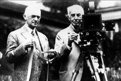 1928年,乔治·伊士曼(左)与托马斯·爱迪生在电影摄影机前合影。此前,爱迪生借助乔治·伊士曼开发的软胶卷,发明了首款电影摄影机。