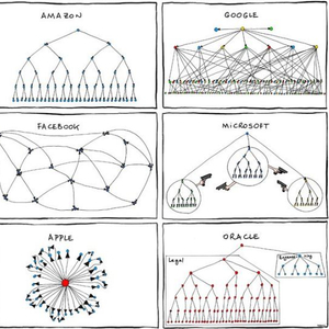 以上漫画在互联网上已流传多年,反映了传闻中多家大型科技公司的组织架构。不过,其中一幅漫画可能需要更新,以跟上苹果公司组织架构的改变。