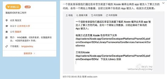 唐巧马上意识到事情可能有点严重。9点45分,他发了一条微博公布了群里关于Xcode漏洞的讨论结果,并附上了软件是否包含Xcode恶意代码的检验方式。后来,这一举动带来的影响远远超出了他的预料。