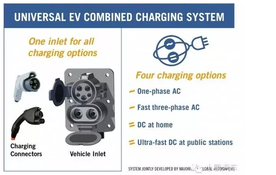 美系和德系的八大厂商福特、通用、克莱斯勒、奥迪、宝马、奔驰、大众和保时捷于2012年发布了“联合充电系统”。将现行所有充电接口统一起来,这样,用一种接口就能够完成单相交流充电、快速三相交流充电、家用直流充电和超速直流充电四种模式,但采用这次组合方式的充电枪不仅丑陋而且笨重。