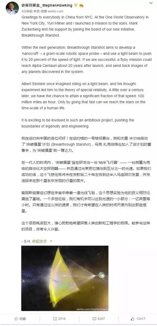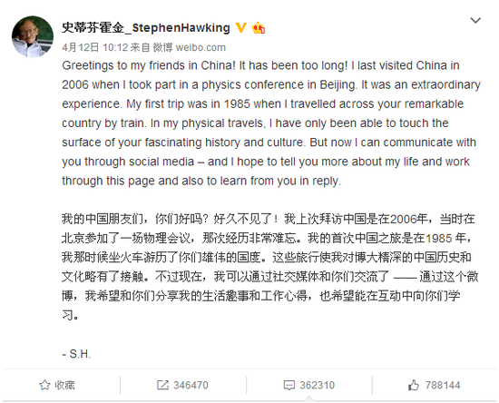 4月12日上午10时12分,霍金在中国发出第一条微博。