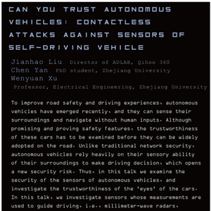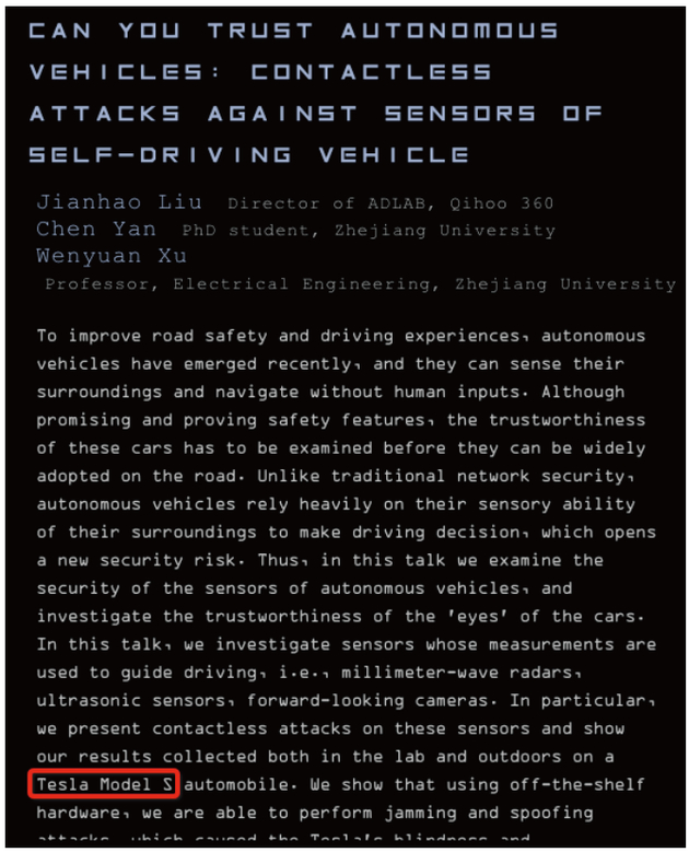 编者按:本文作者刘健皓,汽车信息安全专家 360攻防实验室负责人,曾在2014年全球首例破解Tesla汽车,2015年协助举办HACKPWN黑客大会破解市面上主流的智能硬件、在Syscan360大会上发表遥控驾驶汽车的演讲,参与国内智能网联汽车信息安全标准制定工作,2016年将在美国黑客大会Defcon和第四届中国互联网大会上(ISC)发表关于传感器漏洞影响自动驾驶安全的演讲以及现场演示破解特斯拉自动驾驶。作者授权36氪发布。