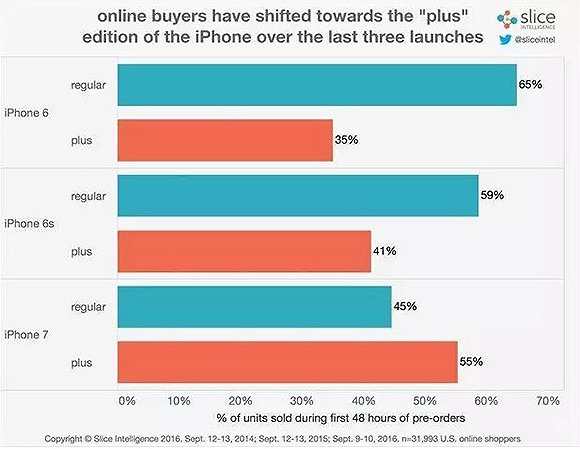 9月17日,美国科技媒体TNW引用Slice Intelligence的报告数据称,iPhone 7 5.5英寸版本比4.7英寸更受欢迎:有55%的顾客订购了iPhone 7 Plus,而iPhone 7的订购者只占45%。