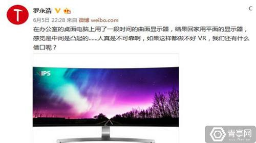 想起今年六月,老罗晒出一张曲面显示器的图片,并在微博上写道:“在办公室的桌面电脑上用了一段时间的曲面显示器,结果回家用平面的显示器,感觉是中间是凸起的······人真是不可靠啊,如果这样都做不好VR,我们还有什么借口呢?”
