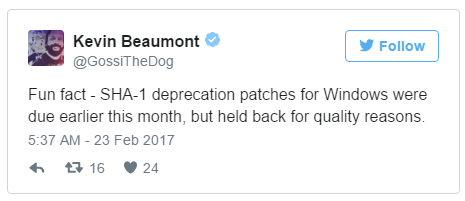微软 Edge 浏览器团队此前在其博客中表示,将于 2017 年中开始弃用 SHA-1。但据《福布斯》网络版报道,另一位安全专家凯文·贝尔蒙特则在 Twitter 上指出,弃用 SHA-1 的 Windows 安全更新本应该在 2 月早些时候推送,但仍处于延期发布的状态。