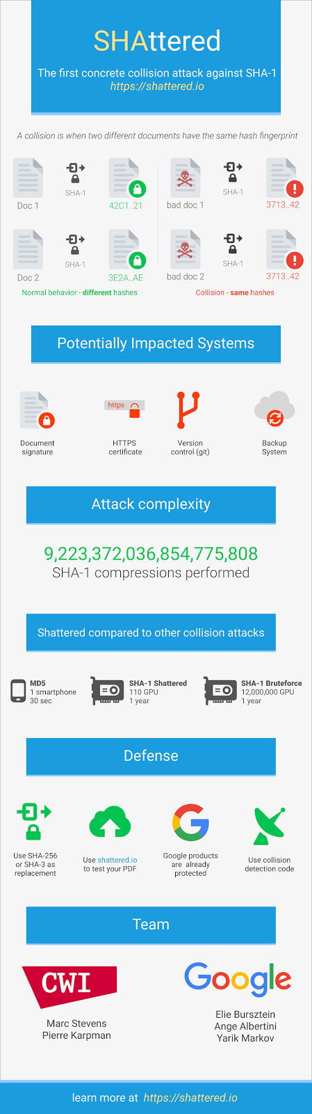 但是!Google 和 CWI 一起研究出了一种方法,能够让两个不同的文件,采用 SHA-1 演算之后,呈现出完全一致的哈希值。