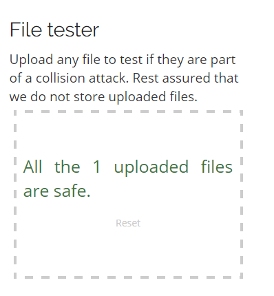 另外,研究者上线了一个网站 shattered.io,网友可以上去了解更多技术细节,还可以上传自己的文件,测试自己的文件是否安全。
