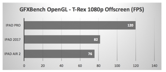 外媒继续测试iPad的图形性能。由于V-Sync的屏幕将iPad限制为60 FPS ,所以外媒首先选择了OpenGL标准的T-Rex Offscreen 1080p来完成这次测试,结果显而易见,iPad Pro继续碾压,而新iPad的得分比iPad Air 2多了6分。