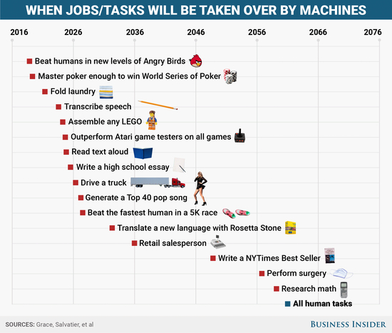 至于那些更复杂和更具创造性的任务,例如写书和进行高等数学运算,则需要更长时间。最终,研究人员发现,到2061年,人工智能将可完成所有人类任务,到2136年将取代所有人类职位。