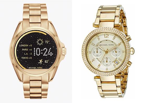 左图为Michael Kors 与Android Wear 推出的智能手表;有右图为Kors’ analog 腕表。