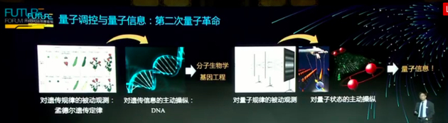 尽管我们目前为止量子力学的非定性检验还没有结束,但是已经为第二次量子革命的诞生奠定的基础。我们可以说什么为了便于大家理解,什么是第二次量子革命我们做一个对比,从前的遗传学规律被动观测,种瓜得瓜,种豆得豆,到后面我们知道所有的遗传的规律是由DNA双链结构来控制的,对分子结构可以控制分子的现状,我们量子信息也是这样的,从前的信息技术都是基于对量子的被动观测,目前我们能够对量子状态进行主动操纵的,利用它可以来做所谓的量子信息了,他的几个主要的应用,就是说刚才丁洪教授已经介绍的,一个我们可以用量子通讯来实现一种原理上无条件的,安全的通讯方式,量子计算可以实现一种超快的计算能力来解释各种各样的复杂系统的规律。