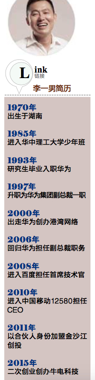 在加入百度两年后,李一男选择再次离职,转身加入中国移动,担任12580的CEO一职。2011年,李一男又辞去职务,并进入创投圈,以合伙人身份加盟了金沙江创投,在金沙江期间,李一男展现出了他独特的睿智,用300万投资的北京数字天域科技有限公司借壳在中小板上市,按当时的市值算,他在这笔投资中赚了将近10亿元。