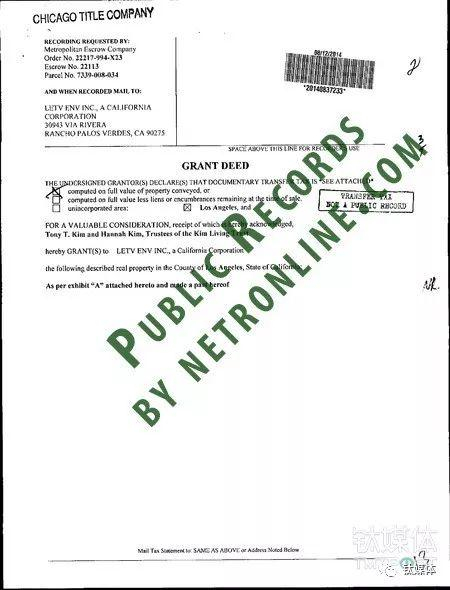 乐视电视LETV ENV INC。将18455 S Figueroa St, Gardena, CA 90248地块及附属建筑受让给法乐第未来公司(本文亦简称FF公司)的文件。