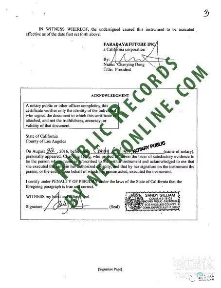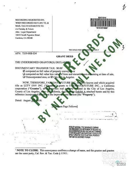 根据地块交易时间推算,LETV ENV INC。刚刚完成大楼和地块购买,就将名字变更成了Faraday &Future Inc。即法乐第未来公司(本文亦简称FF公司)。两年之后的2016年9月7日,最新的交易内容显示,乐视电视LETV ENV INC。公司才在这一天将该地块和附属建筑物在法律上授让给了自己两年前就更换的新名字,法乐第未来公司(本文亦简称FF公司)。地块所属权也在这一天随即被变更。也就是说在这一天,财产法律所属权上,乐视系公司的这份资产正式变成了FF系的资产。