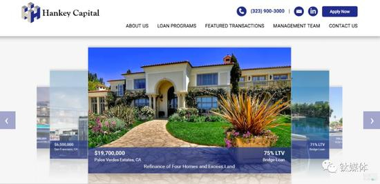 贷款公司Hankey Capital 公司网站首页上,贾跃亭的7号别墅照片和抵押贷款信息