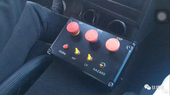 扶手柜前端位置,是一块临时加装的按钮控台,HV、EPS、ESP,甚至车辆喇叭等功能按键都放在这里