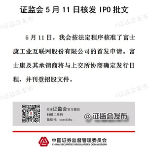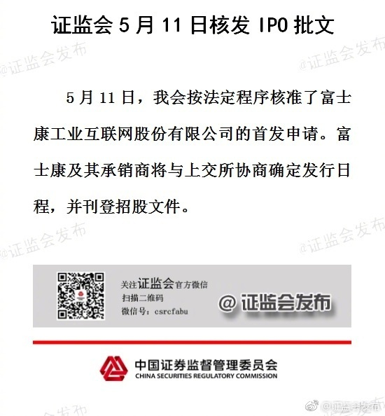 新浪科技讯 5月11日晚间消息,证监会官方微博@证监会发布 发表《证监会5月11日核发IPO批文》称,证监会按法定程序核准了富士康工业互联网股份有限公司的首发申请。富士康及其承销商将与上交所协商确定发行日程,并刊登招股文件。