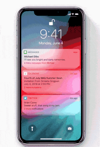 在iOS 12里,自相同应用的同类通知会自动归入一组,在通知/锁屏界面上显示分组归类好的通知,而不是将每一条通知都显示出来,显得更整洁了。