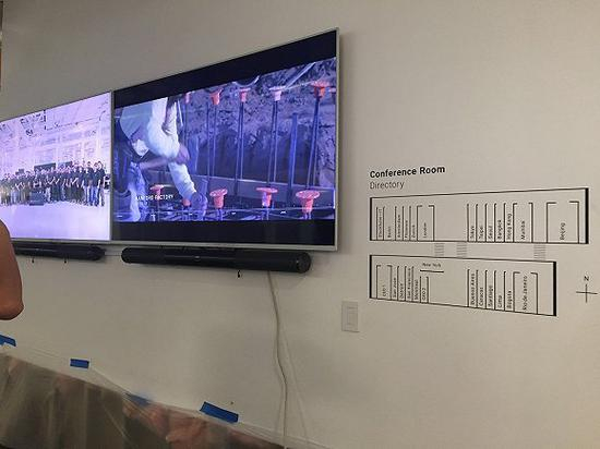 贾跃亭工位斜对面的墙上挂着两个巨大的乐视电视,循环滚动着FF在Hanford工厂车间的生产情况,员工合影以及第一辆FF91下线时的情形。旁边的会议室地图上,每一间会议室都被以柏林、北京、纽约等世界各地的城市命名。