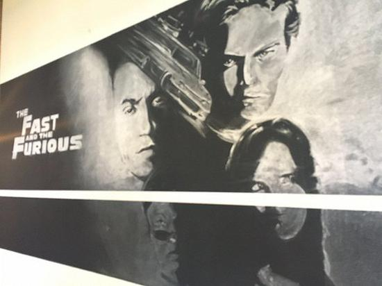 在FF位于洛杉矶办公室的入口,一出电梯门就看到一个小型视频会议的简易吧台,旁边的粘贴板上贴着当天工作推进的流程图。墙上画着速度与激情电影的墙绘,员工餐厅的墙壁上员工们用中、英文以及各种语言写着:永创第一(Fight To The First)。