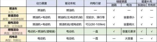 普通混动:油+电驱动,电池以燃油机、动能回收等充电,一般容量较小,仅起步时为纯电