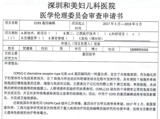 图中显示项目起止时间为 2017.3-2019.3,与贺建奎开始招募志愿者的时间大致吻合,“通过基因编辑生产 CCR5 突变的孩子”的项目内容也一致。