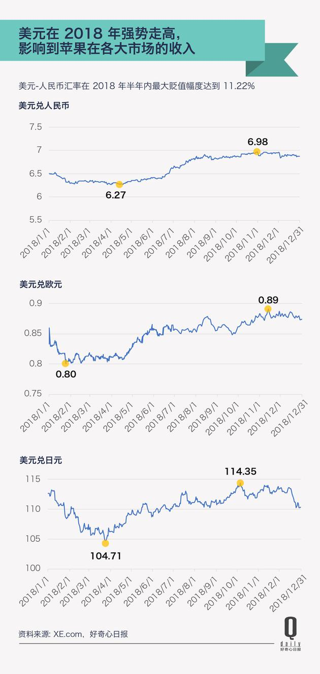 美元的强势被库克列为第二个导致营收降低的原因。从今年下半年开始,无论是人民币还是欧元、日元,都对美元出现一路贬值的情况,人民币最大贬值幅度达11%,欧元10.1%,日元8.4%。