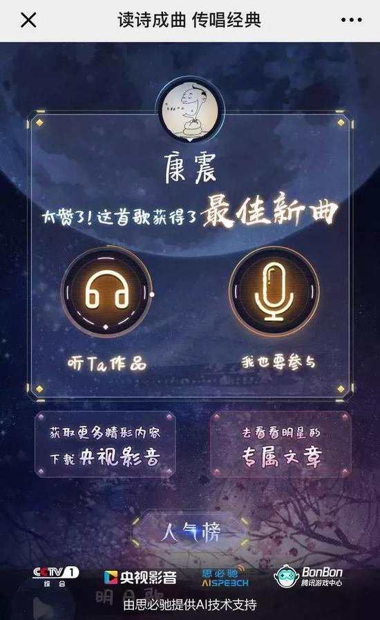 节目鉴赏团中的康震老师,一直为我们解读经典诗词背后的故事和含义,在利用“读诗成曲”的技术听到自己的专属经典单曲后,他说:“真是太棒了!刚刚读出诗词,就能唱出经典,如此方便快捷,尽在手机方寸之间!“读诗成曲”启动人工智能,开启了全民共唱经典、人人能唱经典、瞬间唱出经典的经典传唱新时代!”现在你也可以像他一样,将您的个人韵味融入经典传承之中!