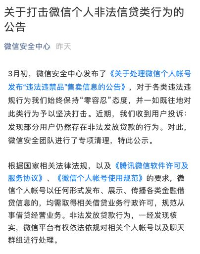 3月18日,微信安全中心官方公号发布《关于打击微信个人非法信贷贷类行为的公告》,称近期收到用户投诉:发现部分用户仍然存在非法发放贷款的行为。微信安全团队已对此进行了专项清理。