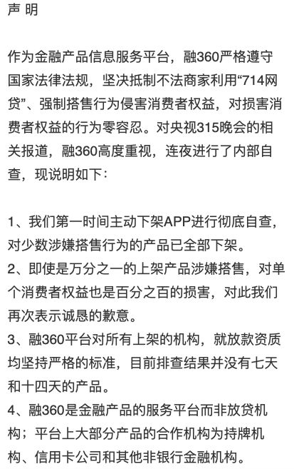融360稍晚发布声明称,对央视315晚会的相关报道高度重视,已第一时间主动下架APP进行彻底自查,对少数涉嫌搭售行为的产品已全部下架,对消费者表示诚恳的歉意。