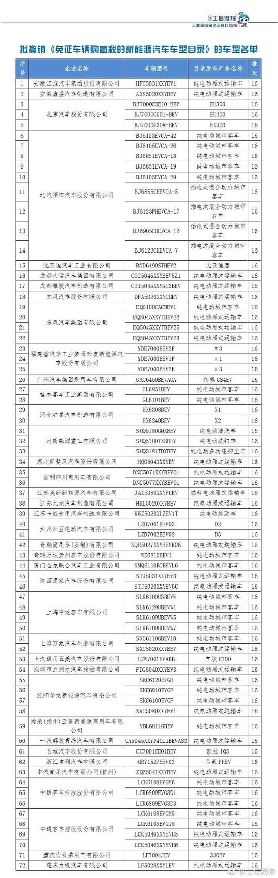 3月26日,工信部公示相关名单显示,根据相关文件要求,对《免征车辆购置税的新能源汽车车型目录》实施动态管理。经统计,第十六批《目录》于2018年2月发布后,共有72款车型在12个月内无产量或进口量,拟从《目录》撤销。